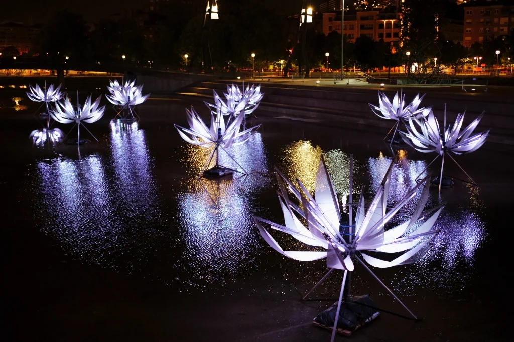 Lotus est un paysage floral qui se déploie dans l’espace et dans lequel le spectateur est invité à déambuler librement. La lumière implantée sur la structure de la plante est diffusée par ses grandes feuilles, créant une ambiance évolutive relaxante. La fleur de Lotus, symbole positif de renouveau et de spiritualité invite à une expérience méditative individuelle ou collective. Les dimensions de l’oeuvre inversent le rapport d’échelle : l’homme fait ici la taille d’un insecte plongé dans une nature immense.