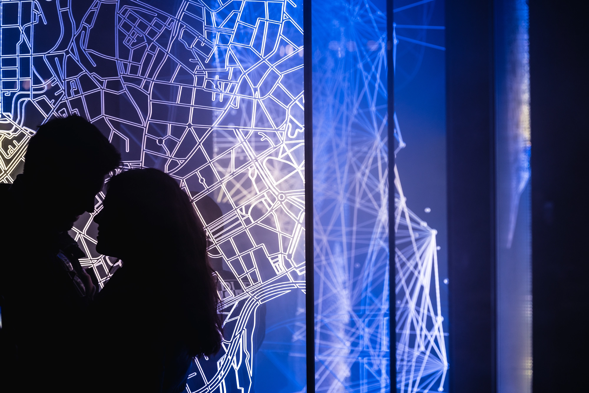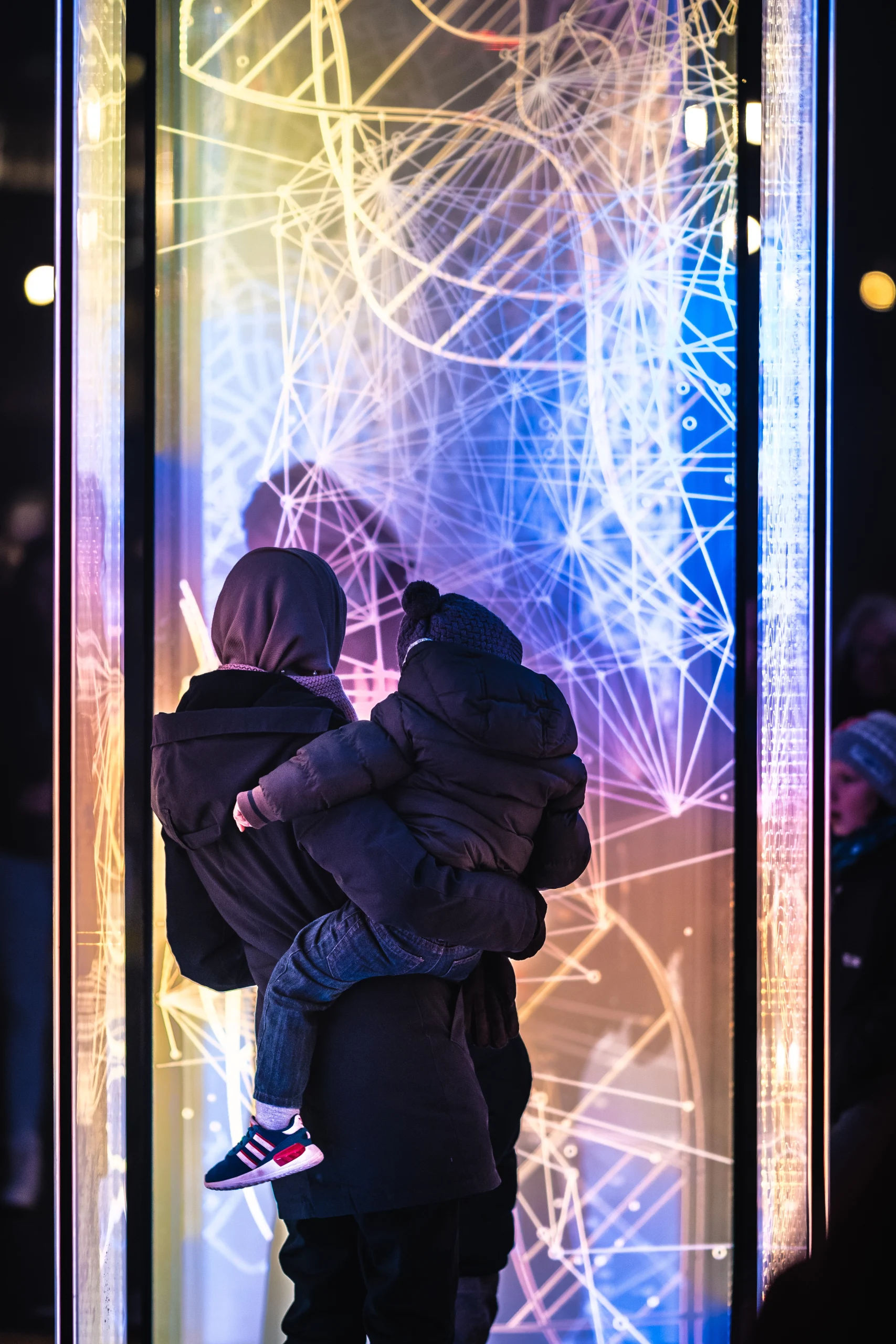 Les spectateurs se déplacent dans l’installation et leurs silhouettes prennent part à l’expérience visuelle, les invitant à se projeter sur leur avenir commun.