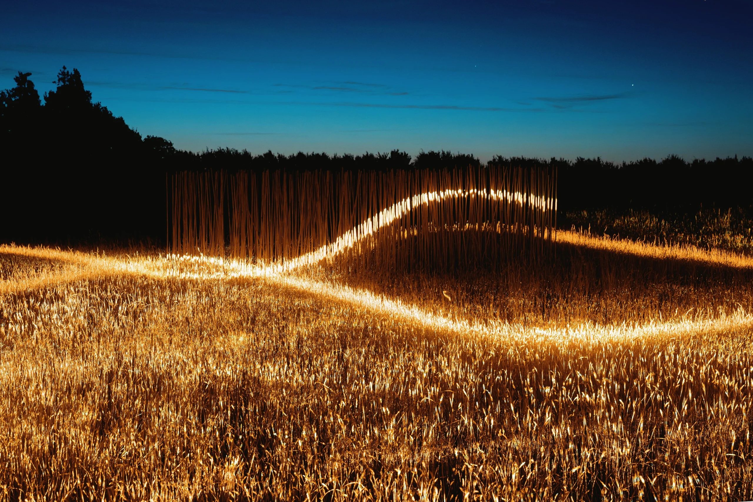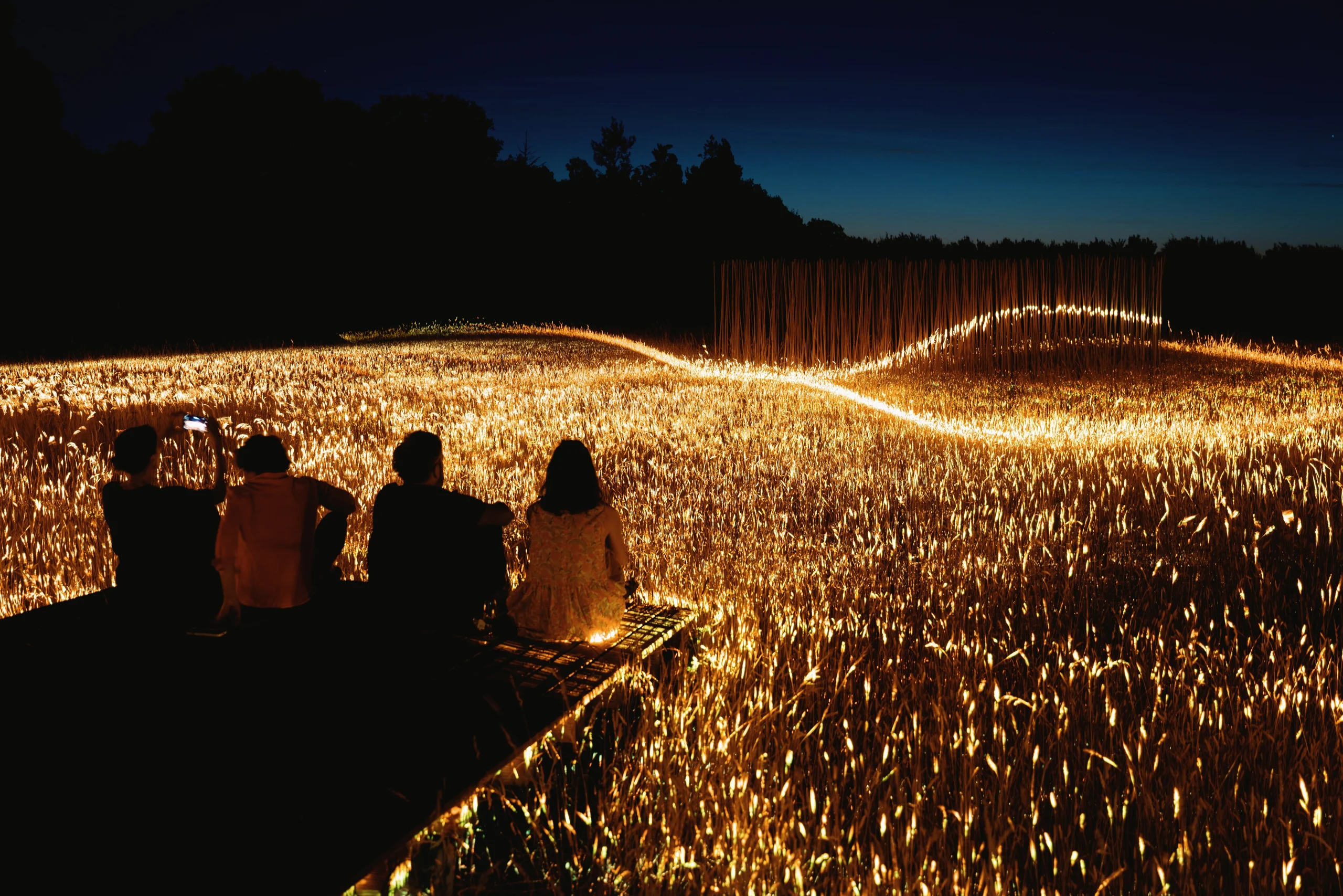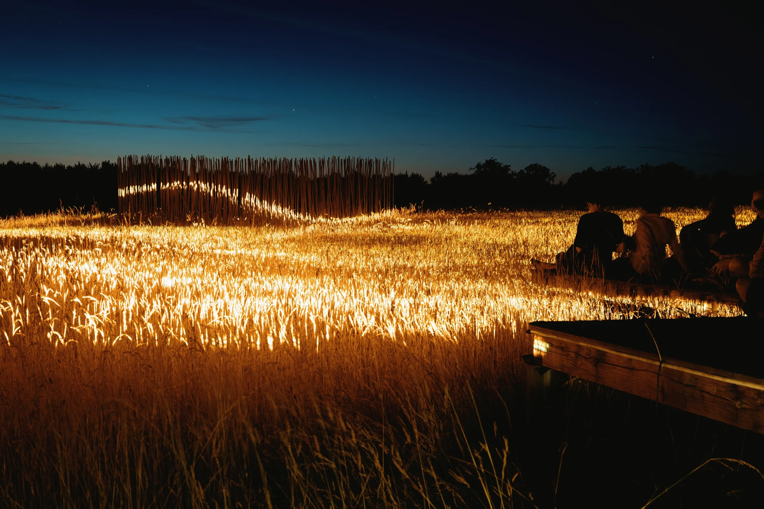 À la tombée de la nuit, des faisceaux laser balayent une grille rectangulaire composée de 500 tiges de bambou, animant leur architecture organique par des vagues de photons. La chorégraphie qui en résulte évoque des rythmes naturels — le souffle lent des marées océaniques ou le doux balancement des hautes herbes — invitant le public à un état de perception méditatif.
