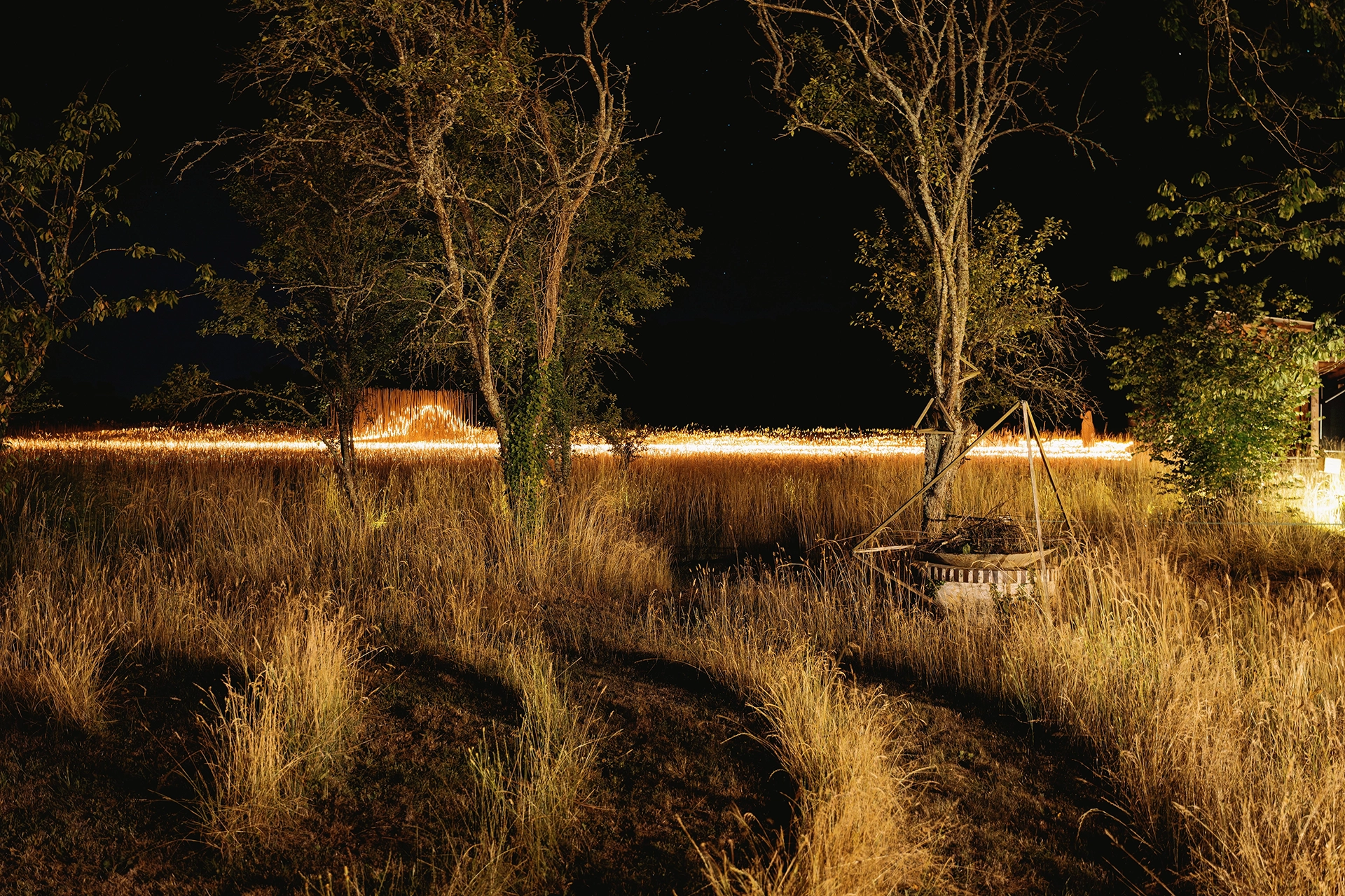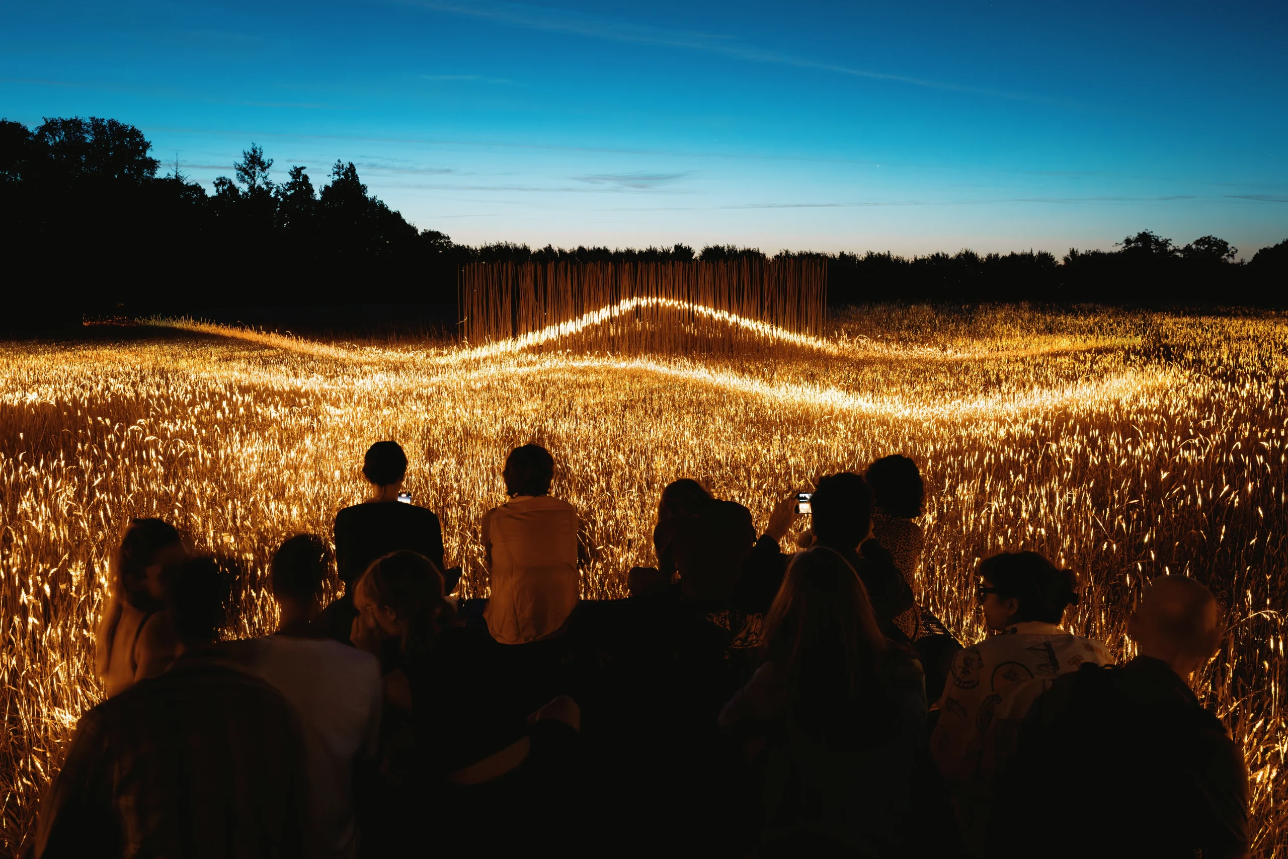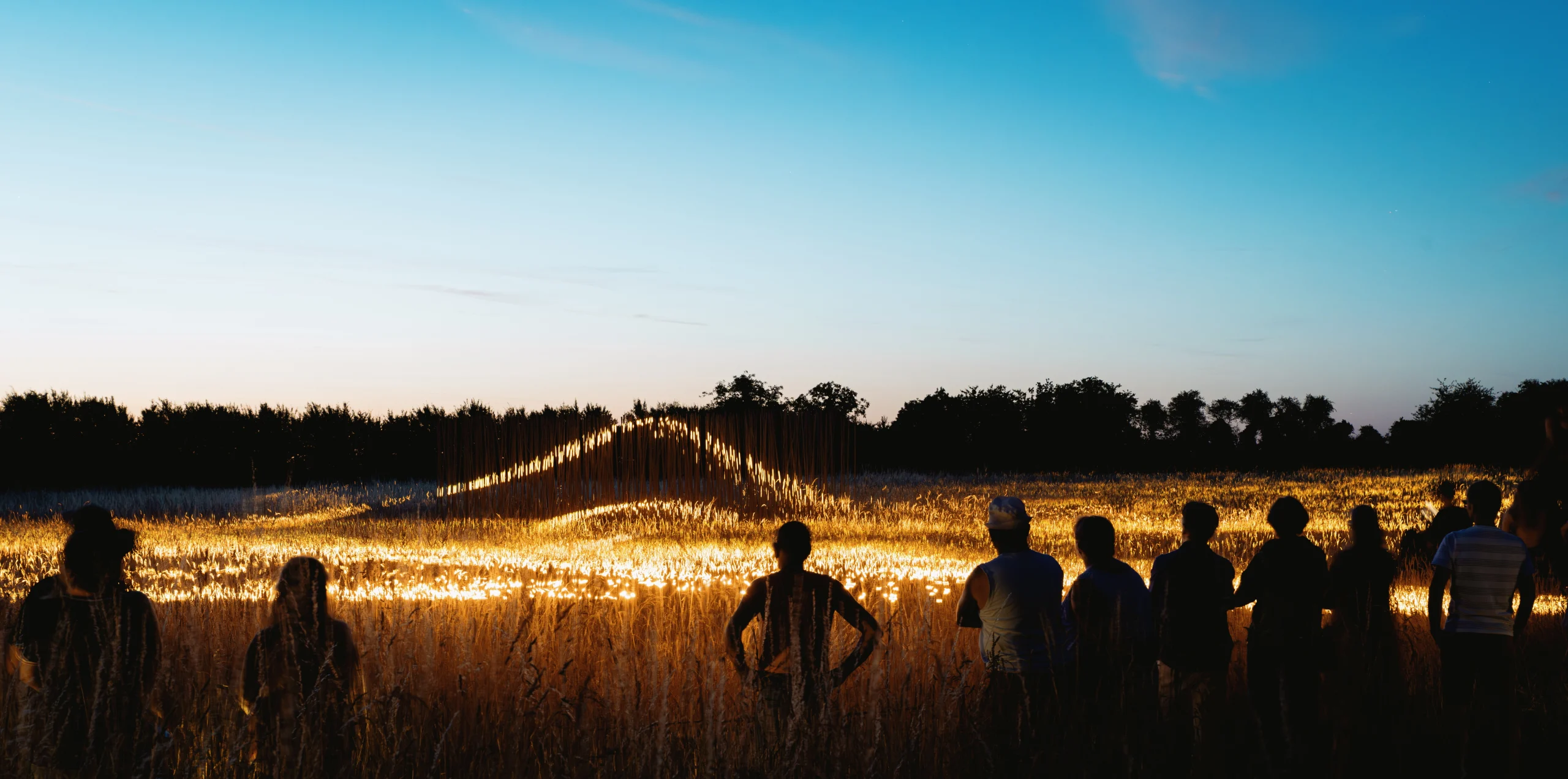 À la tombée de la nuit, des faisceaux laser balayent une grille rectangulaire composée de 500 tiges de bambou, animant leur architecture organique par des vagues de photons. La chorégraphie qui en résulte évoque des rythmes naturels — le souffle lent des marées océaniques ou le doux balancement des hautes herbes — invitant le public à un état de perception méditatif.