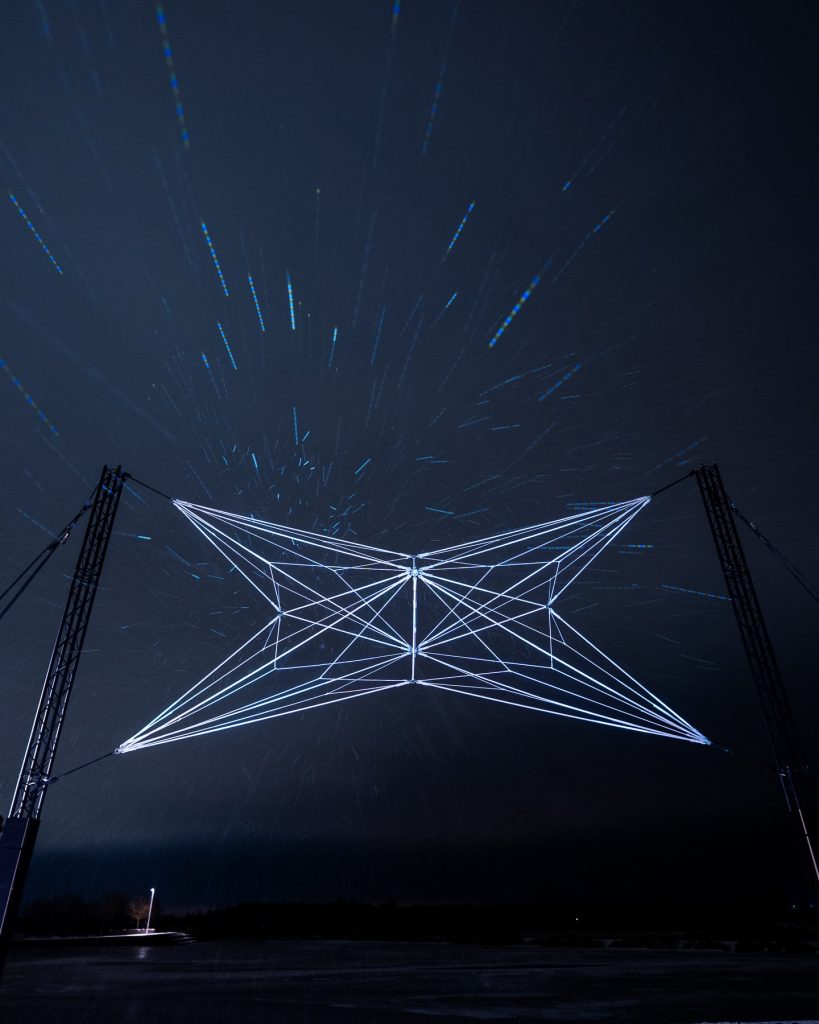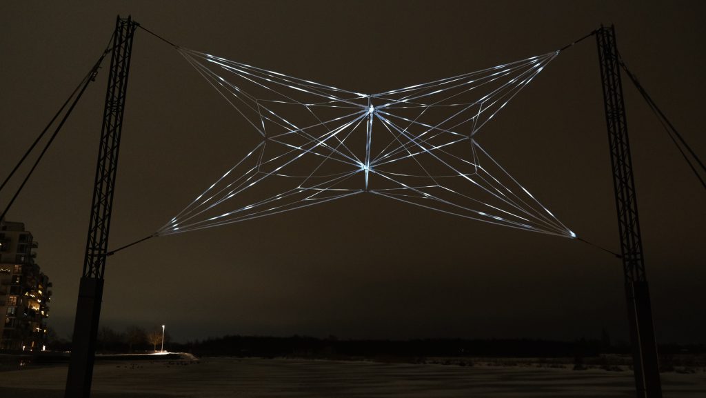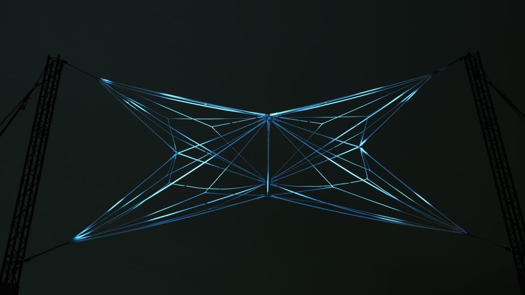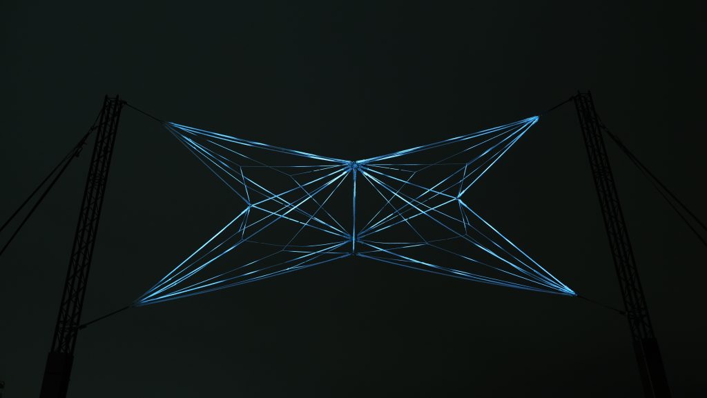 En utilisant des matériaux minimalistes, WEB veut matérialiser à grande échelle ce cloud intangible qui nous relie tous et en révéler l’ambivalence. À la fois captivante et potentiellement dangereuse, cette toile que nous avons tissée pour mieux communiquer ne nous rend-elle pas prisonniers ?
